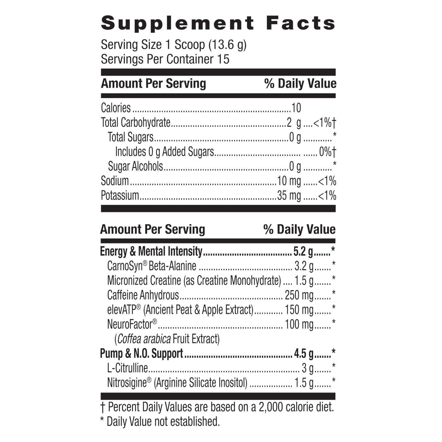 3.2g of CarnoSyn® beta-alanine 1.5g of micronized creatine and 250mg of caffeine per serving to support energy and mental intensity*