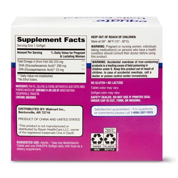 Equate Daily Prenatal Multi & DHA is a complete multivitamin with nutrients that matter to mom and baby. It is specifically formulated to supply important nutrients a woman's body needs before; during; and after pregnancy. This combo pack includes 30 prenatal multivitamin tablets and 30 prenatal DHA/EPA softgels. Complete multivitamin tablets deliver key nutrients such as folic acid and iron; and DHA softgels may help support healthy fetal cognitive and vision development during pregnancy. Both formulas are gluten- and lactose-free. Take care of your prenatal nutrient needs with Equate Daily Prenatal Multi & DHA combo pack!*