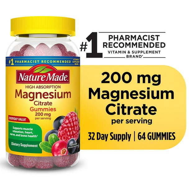 Nature Made High Absorption Magnesium Citrate 200 mg per serving is a Magnesium supplement for women and men that supports muscle relaxation; heart health; nerve health and bone health. This High Absorption Nature Made Magnesium supplement is sourced from high-quality ingredients. Each Magnesium gummy is made with pectin not gelatin; and is gluten free with no artificial flavors; no synthetic dyes; no high fructose corn syrup; and no artificial sweeteners. This Nature Made Magnesium Citrate supplement offers gummies in a delicious; mixed berry with other natural flavors. With over half of the U.S. population not consuming enough Magnesium in their diet; these Magnesium 200mg per serving gummies are a tasty way to supplement the Magnesium your body needs (1). Adults chew two Magnesium gummies daily. Nature Made Magnesium supplements are quality you can trust. (1) Reider; C.A.; Chung; R.-Y.; Devarshi; P.P.; Grant; R.W.; Hazels Mitmesser; S. Inadequacy of Immune Health Nutrients: Intakes in US Adults; the 2005–2016 NHANES. Nutrients 2020; 12; 1735. *Based on a survey of pharmacists who recommend branded vitamins and supplements. Mineral Supplement