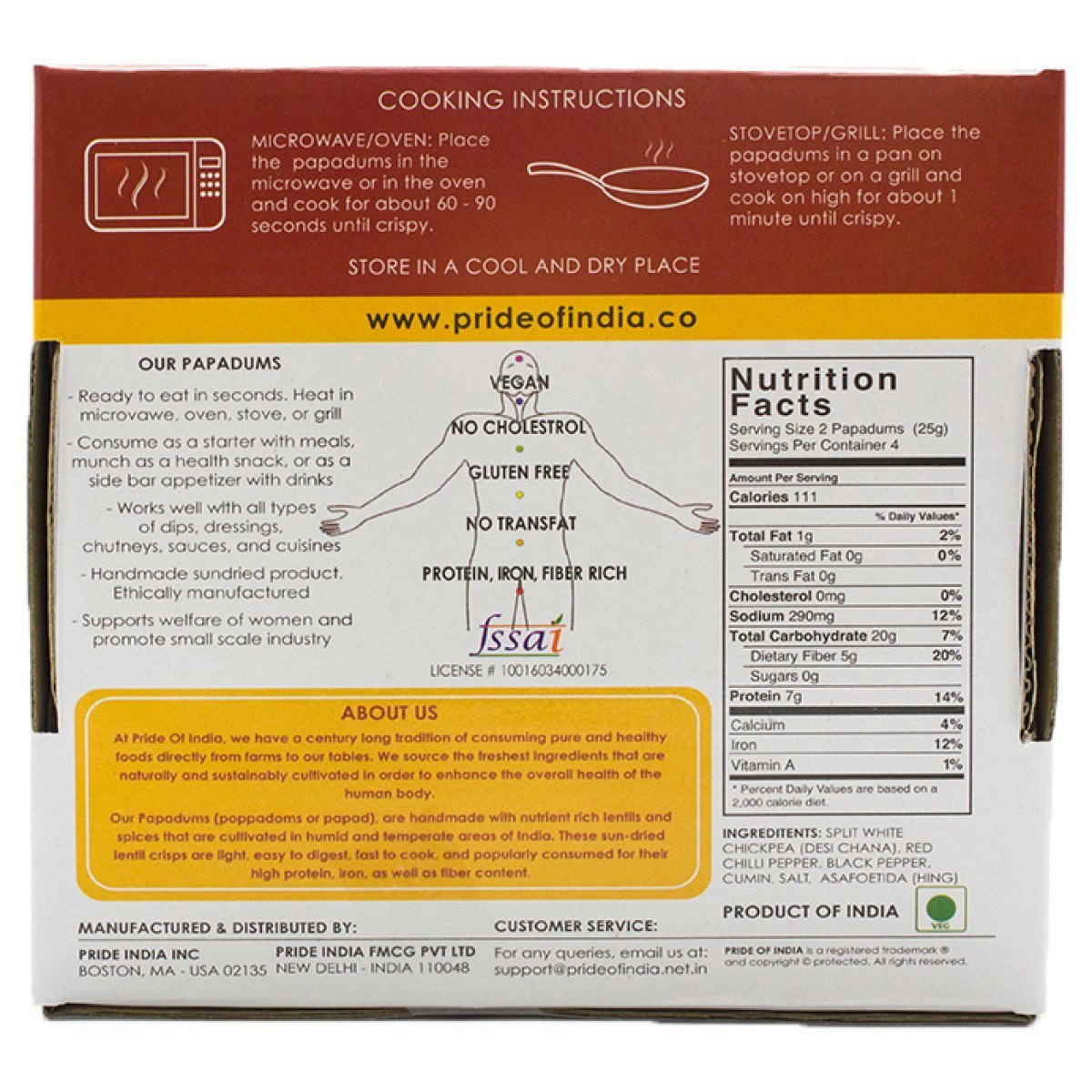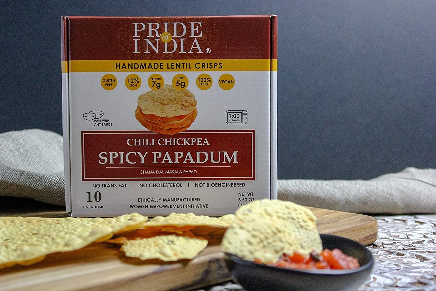 Pride of India incorporates organically-grown food and herbal products from India into our daily life. These all-natural ingredients help enhance the overall health of the human body. Pride of India is family owned and operated, and we manufacture our products in the USA. Indian papadums (poppadoms or papad) are a traditional Indian snack food. They are similar to tortillas and flatbreads. Our papadums are made of chickpeas, lentils and Indian spices. Lentils contain healthy protein, iron, and fiber. Plus, they help reduce cholesterol. Because these lentil crisps are gluten free and don’t have trans fats, they are a healthier snack than traditional potato chips. These papadums are also handmade by women in India, and each purchase of these lentil crisps contributes to small businesses and women empowerment in India. Popadums are usually made as a dough that needs to rest before baking. These lentil crisps, however, are ready in seconds! Just put them over a heat source (oven, microwave, stove, etc.) for 60 to 90 seconds until crispy. Lentil crisps are a great meal starter or snack. With an intoxicating blend of Indian spices, you can eat them alone or dip them in sauces, curries, or hummus. This package contains 10 chili chickpea spicy papadum. Try other flavors of lentil crisps, and shop other health and beauty products by Pride of India.