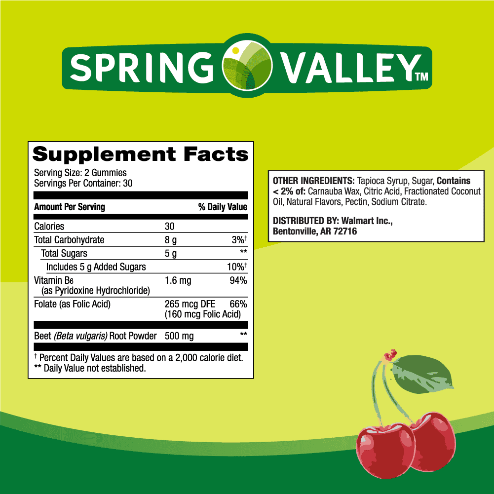 Spring Valley 500 mg Beet Root Vegetarian Gummies; 60 Count are the simplest; best-tasting way to support heart health*. Our delicious and easy to chew gummies make taking your daily beet root supplement a joy.