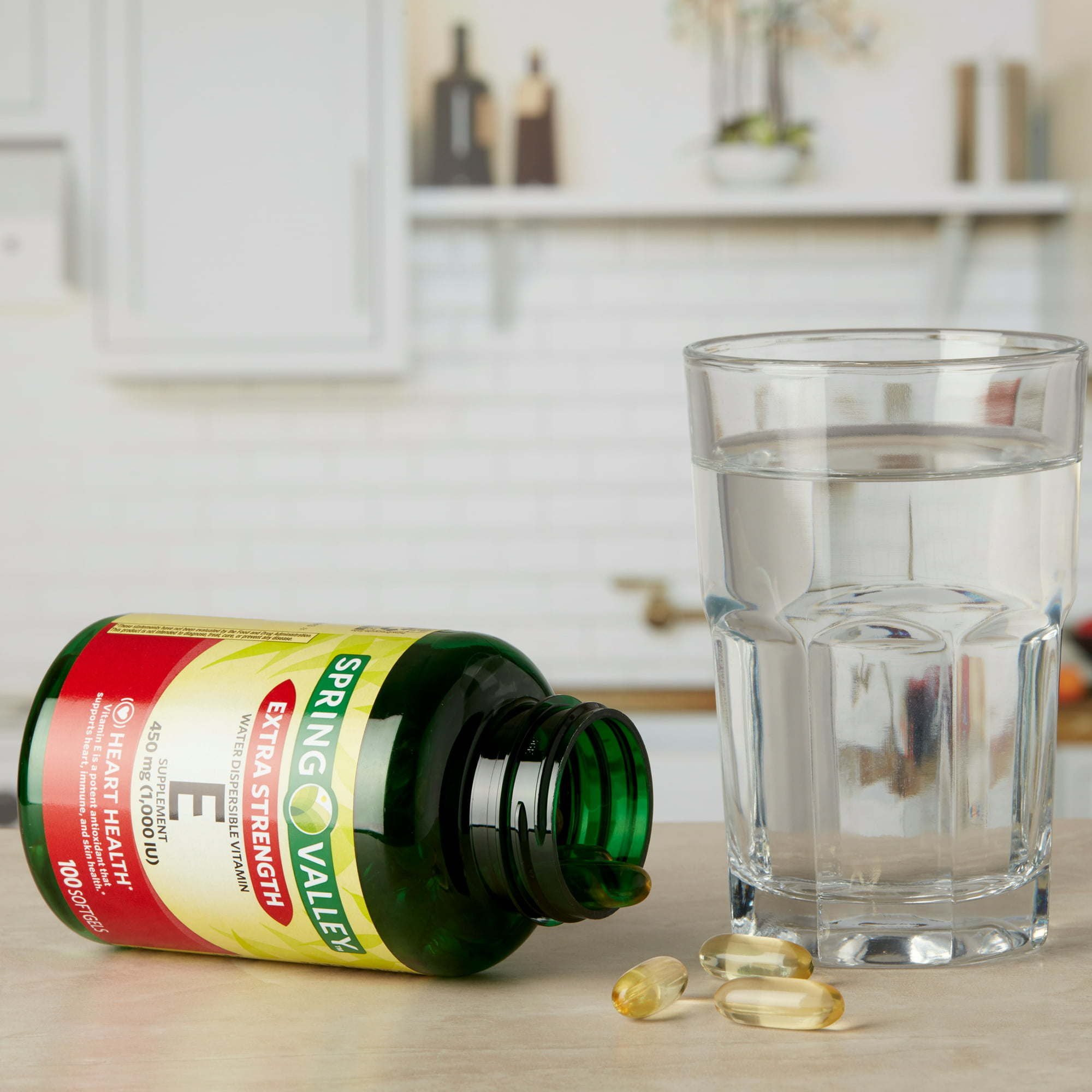 Our Spring Valley Extra Strength Water Dispersible Vitamin E Softgels; 450 mg (1; 000 IU) is a supplement formulated to support heart health.* The extra strength formula delivers 450 mg (1; 000 IU) of vitamin E per softgel. Vitamin E is a potent antioxidant that supports heart; immune; and skin health.* The suggested adult dosage is one softgel per day; preferably with a meal. These softgels disperse in water and are free of gluten; salt; lactose; artificial colors and flavors. You can rest assured that Spring Valley Extra Strength Water Dispersible Vitamin E Softgels Supplement; 450 mg (1; 000 IU) is produced with strict quality guidelines and backed by our quality guarantee.