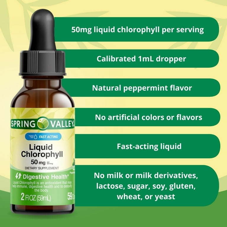 Spring Valley Fast Acting Chlorophyll Digestive Health Dietary Supplement Liquid, Peppermint, 50 mg, 2 fl oz Spring Valley Fast Acting Chlorophyll Digestive Health Dietary Supplement Liquid, Peppermint, 50 mg, 2 fl oz Spring Valley Fast Acting Chlorophyll Digestive Health Dietary Supplement Liquid, Peppermint, 50 mg, 2 fl oz