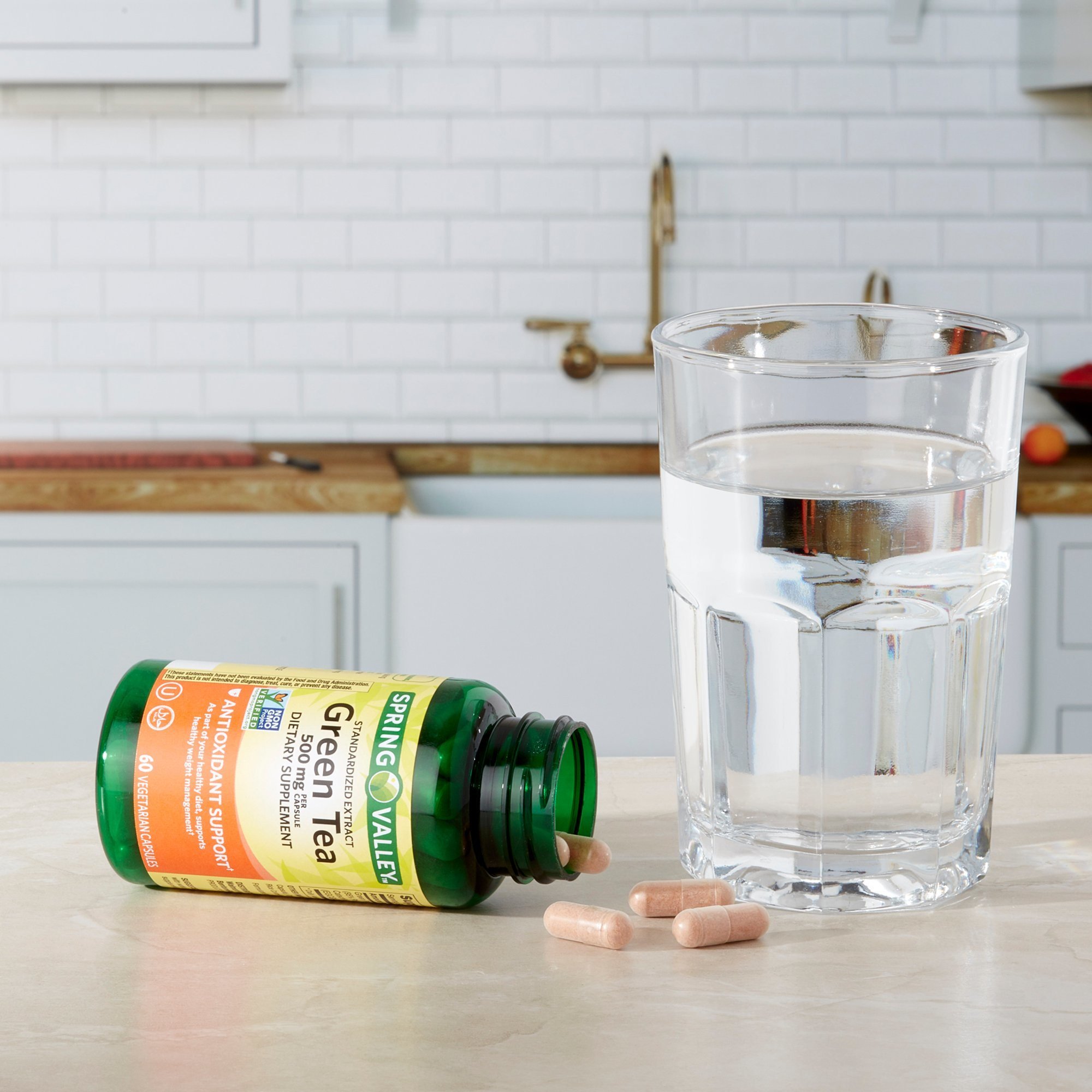 Spring Valley Green Tea Extract Vegetarian Capsules are a dietary supplement that provides antioxidant support. As part of your healthy diet; it supports healthy weight management.* Each serving contains 500 mg of green tea extract and has approximately 15 mg of caffeine. These vegetarian capsules have no gluten; yeast; wheat; milk or milk derivatives; lactose; soy; sugar; artificial preservatives; artificial color; artificial flavor; fragrance; benzoates; coal tar dyes; MSG; non-intent BPA; or phthalate. Supplement your healthy lifestyle with Spring Valley Green Tea Extract Vegetarian Capsules.