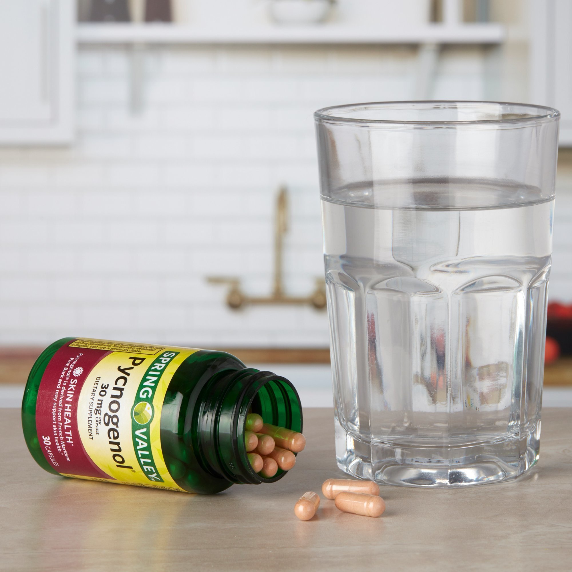 Spring Valley Pycnogenol Dietary Supplement; 30 mg is a dietary supplement designed for healthy skin. Pycnogenol is derived from French Maritime Pine Bark and may support skin health. The suggested adult use is to take one capsule four times daily; preferably with a meal. This supplement contains no yeast; wheat; milk or milk derivatives; lactose; sugar; preservatives; soy; artificial colors; or artificial flavors and contains less than 5 milligrams of sodium per serving. You can rest assured that Spring Valley Pycnogenol Dietary Supplement; 30 mg is produced with strict quality guidelines and is backed by our quality guarantee.